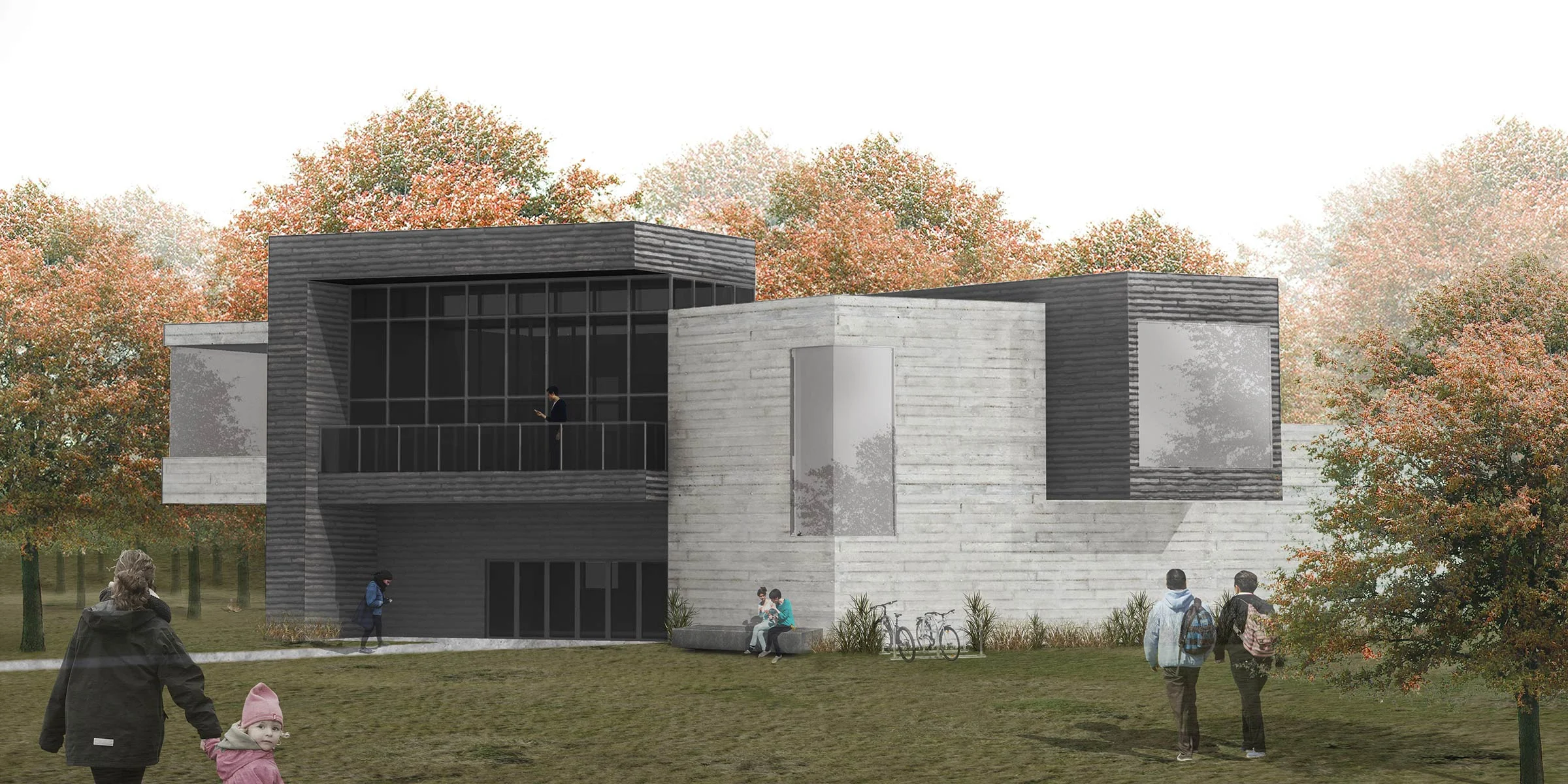 The main structure is a concrete shell positioned on the major axis of the site, cut down the middle to introduce light and define spaces of rest and spaces of movement. Lighter steel rods wrap the building and penetrate the concrete to mediate the connection with the outside and define ancillary, subordinate volumes of space (the food truck pavilion, the bus pavilion). Inside, the concrete recedes to expose the tectonic connections between the steel and the concrete. Another volume collides with the main structure where all the paths meet, providing a sense of hierarchy, and is oriented along the most beautiful axis in the park, opening up to allow people to disperse off the path into the landscape.